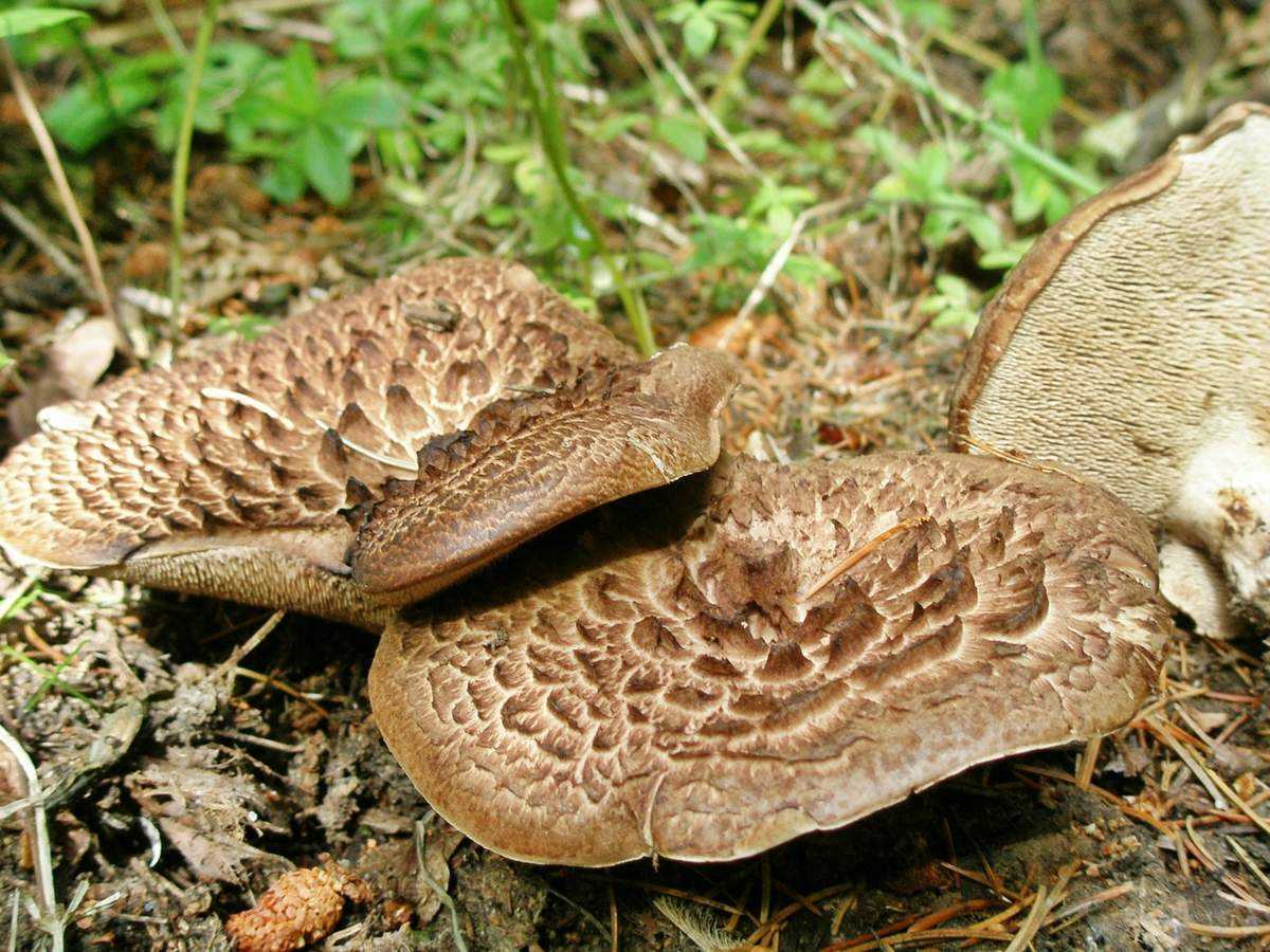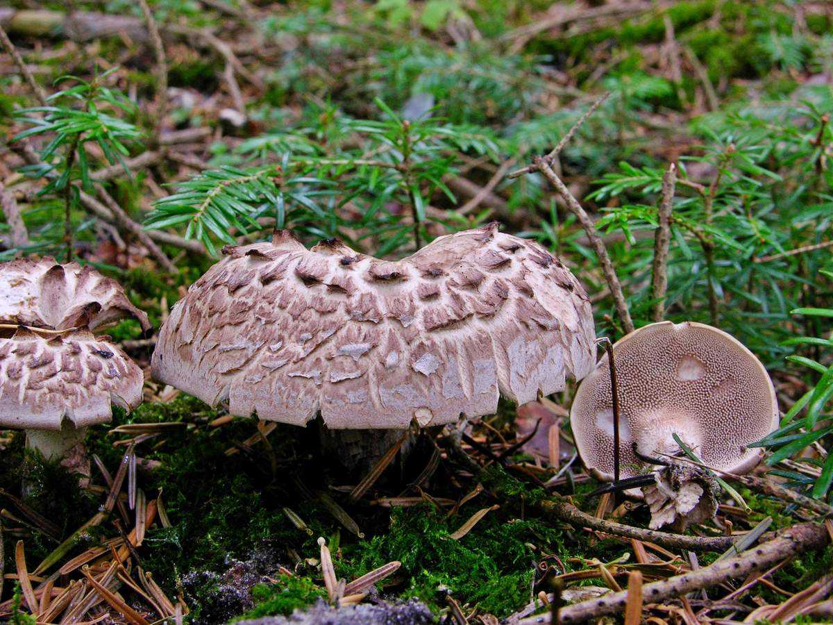 Возраст пестрого саркодона еще определяют по волнистой окантовке. У молодого экземпляра край шляпки выгнут вверх, а у старого – вниз. Отличительной чертой ежовика является необычная кожица в виде чешуек еловой шишки или черепицы. По ее цвету аналогично можно определить возраст. У молодого гриба кожица бурая, а шляпка старого экземпляра почти черная с буроватым оттенком.