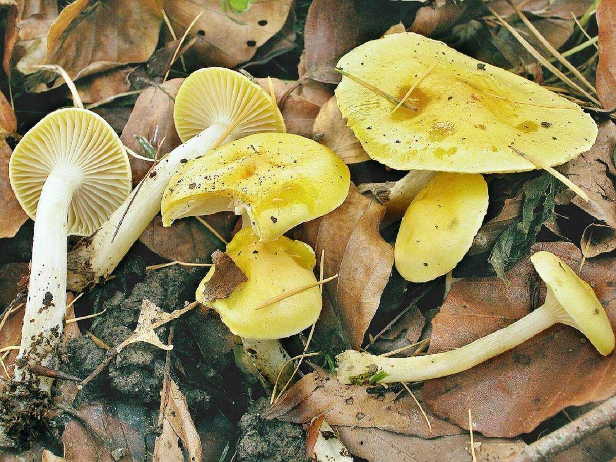Этот гриб гигрофор имеет очень приметную шляпку ярко-лимонного или желтого цвета. Она распростертая и покрытая довольно большим слоем слизи. Цилиндрической формы ножка, которая у основания немного утолщается, вырастает до восьми сантиметров.