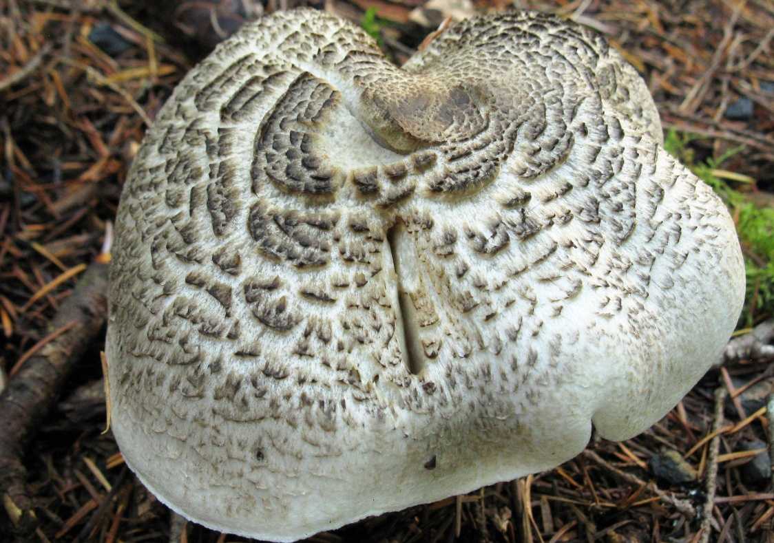 - от верхушки шляпки к краям расходятся тонкие полоски, которые у взрослых грибов преобразуются в трещины, после чего края шляпки между этими трещинами приподнимаются вверх;