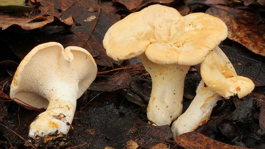 Ложные пластинки светлого оттенка. Запах грибной, приятный. Растет трубковидная лисичка с августа до конца октября. Встречается рядом с хвойными деревьями.