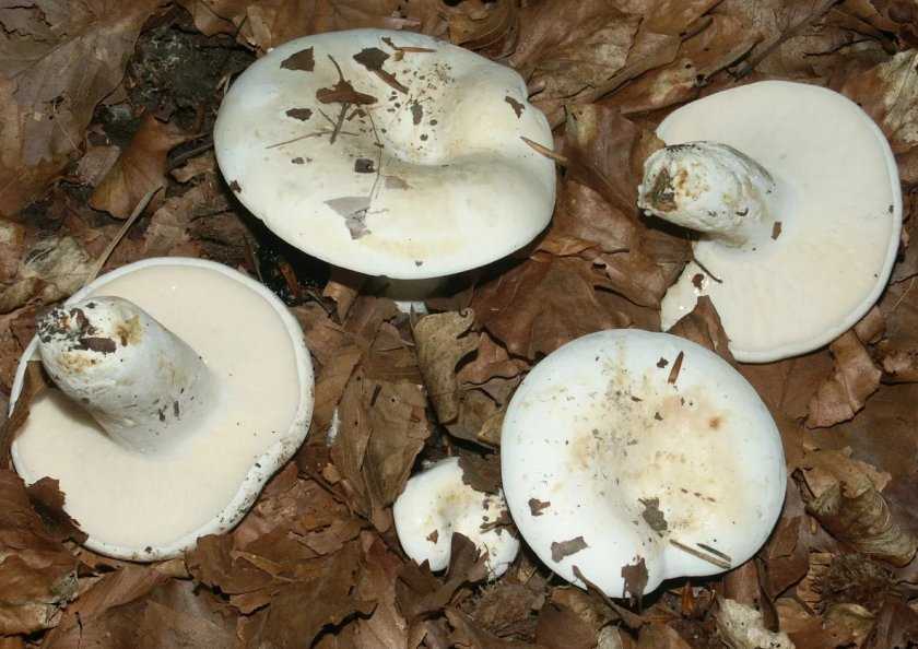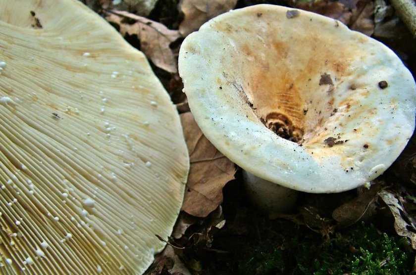 - Груздь сизоватый. Условно-съедобный гриб. Шляпка белая, сухая, иногда немного бархатистая. Цвет пластинок белый или кремовый. Ножка довольно высокая – до 9 см, к основанию сужается. Млечный сок медленно приобретает зеленоватый оттенок. С возрастом гриб покрывается желтоватыми или палевыми пятнами. Растет только в лиственных лесах.