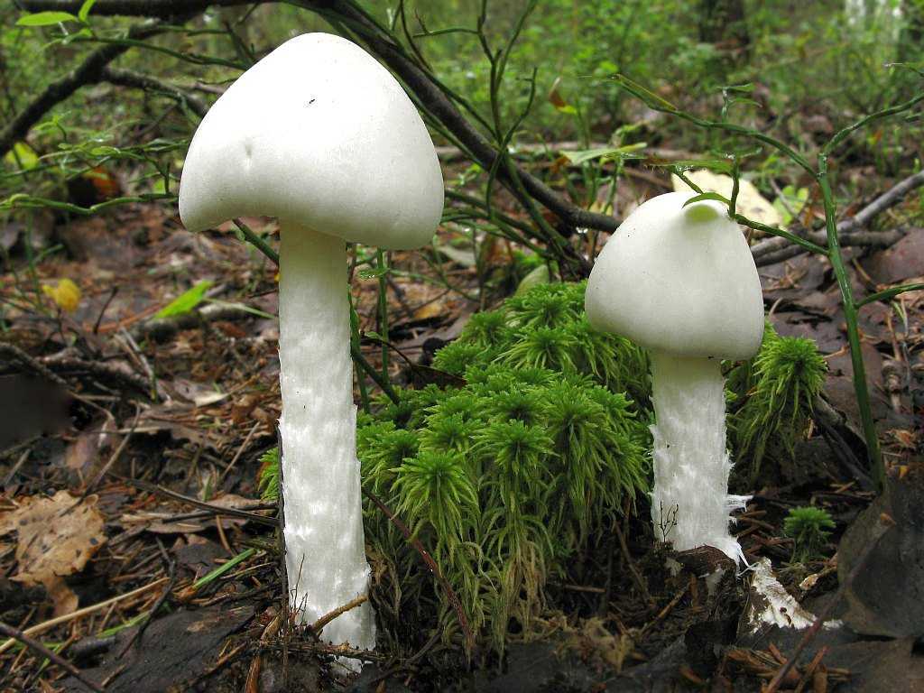 Пожалуй, наиболее коварный «отравитель» — Бледная поганка (Amanita phalloides). У этого гриба шляпка — диаметром 5-15 см, изначально похожа на колокольчик или яйцо, позже распростёртая, покрыта радиально расположенными волокнами. Край гладкий. Белого цвета с матовым шелковистым блеском, влажная и слегка липкая. Пластинки — плотные, белые, округлые, молодые покрыты беловатой крышкой. Ножка — белого цвета, толстая, цилиндрическая, 7-16 см высотой, 1-2 см толщиной, у основания клубень диаметром до 4 см, под кольцом гладкая, над ним с беловатыми чешуйками, иногда с зигзаговидным узором. Кольцо — четкое, белое, гладкое или слабо бахромчатое. Мякоть — белого цвета, мягкая в шляпке, в ножке хрящеватая, вкус мягкий и сладковатый, аромат интенсивный, особенно у пожилых особей, напоминает сырой картофель. Споры – беловатые.