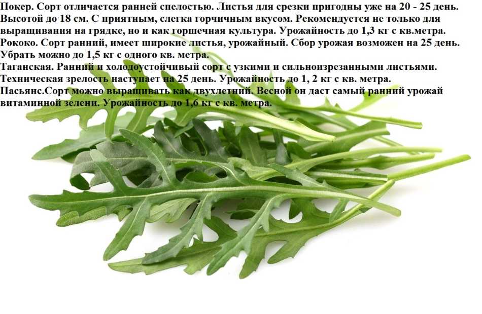 - Наилучший из рано поспевающих сортов рукколы — Покер. Сделать первый салат из свежей руколы можно уже спустя 21 день после высадки.