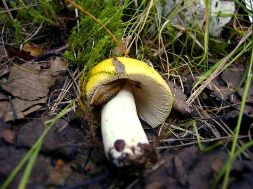 Гриб светло-жёлтой разновидности по форме выпуклый. Шляпка насыщенно-жёлтая, отчасти охристая. Мякоть прочная, белая, при разрезании становится серой. Грибы слегка душистые. Мякоть зачастую сладкая, иногда присутствует остринка.