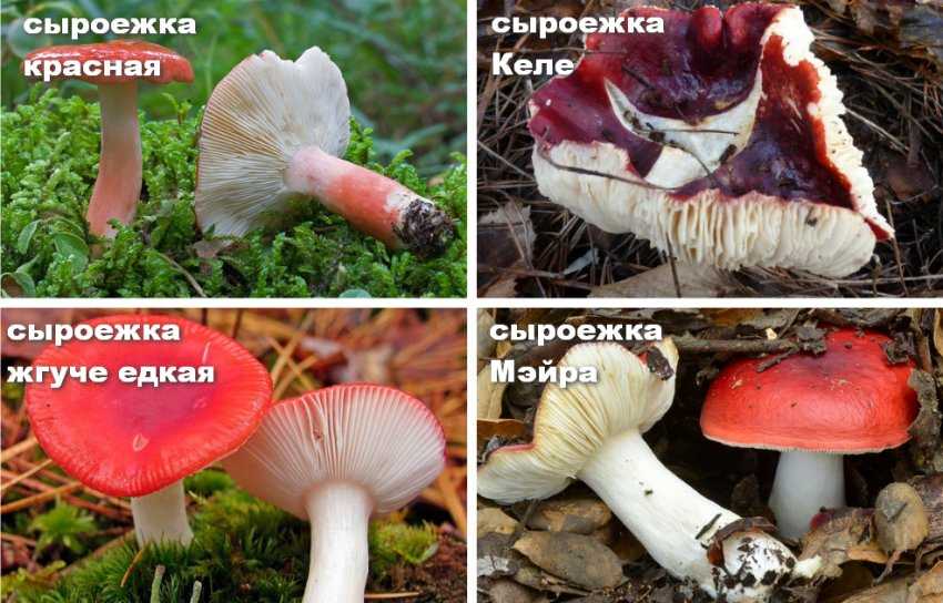 - сыроежка Келе — окрас как у съедобных видов, но отличия в приросших к ножке пластинках, закрученных к верху краях шляпки и пожелтением мякоти на срезе;