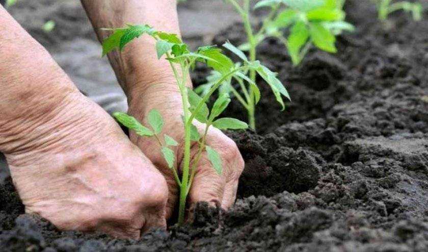 В открытый грунт или теплицы рассаду переносят, когда прогреется почва и воздух свыше +10°С. Гряды разрыхляют, лунки располагают по схеме 50 на 60 см. Растения переносят, не разрушая земляной ком и не затрагивая корни, способом перевалки. В лунке томат располагают вертикально, не заглубляя. Засыпают почвой с гряды и слегка ее приминают.