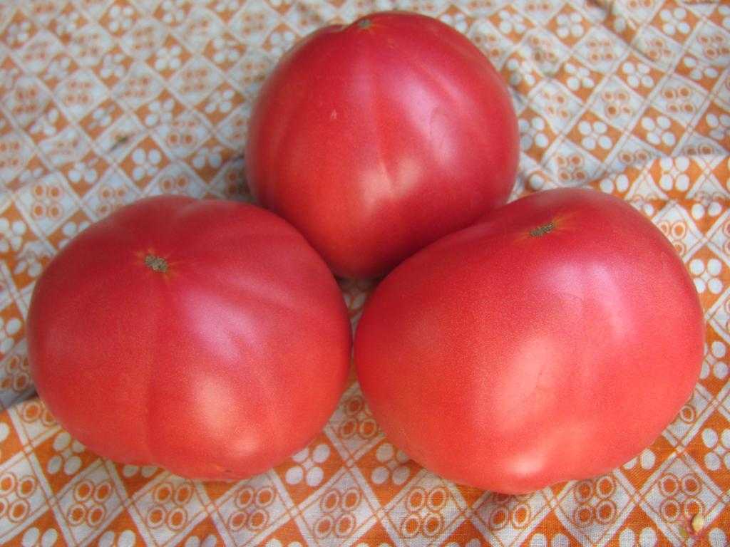 Форма плодов плоскоокруглая, поверхность ребристая. Масса одного помидора достигает 300-500 г. Кожица глянцевая, окрашена в насыщенный малиновый цвет. Мякоть плотная, не сильно сочная, сахарная. Вкус овощей – сладковатый. Растения проявляют устойчивость к табачной мозаике, мучнистой росе и фитофторе. Недостатком сорта является тонкая кожица, которая не позволяет долго хранить томаты и транспортировать на большие расстояния. Плоды могут растрескиваться при перенасыщении почвы влагой.