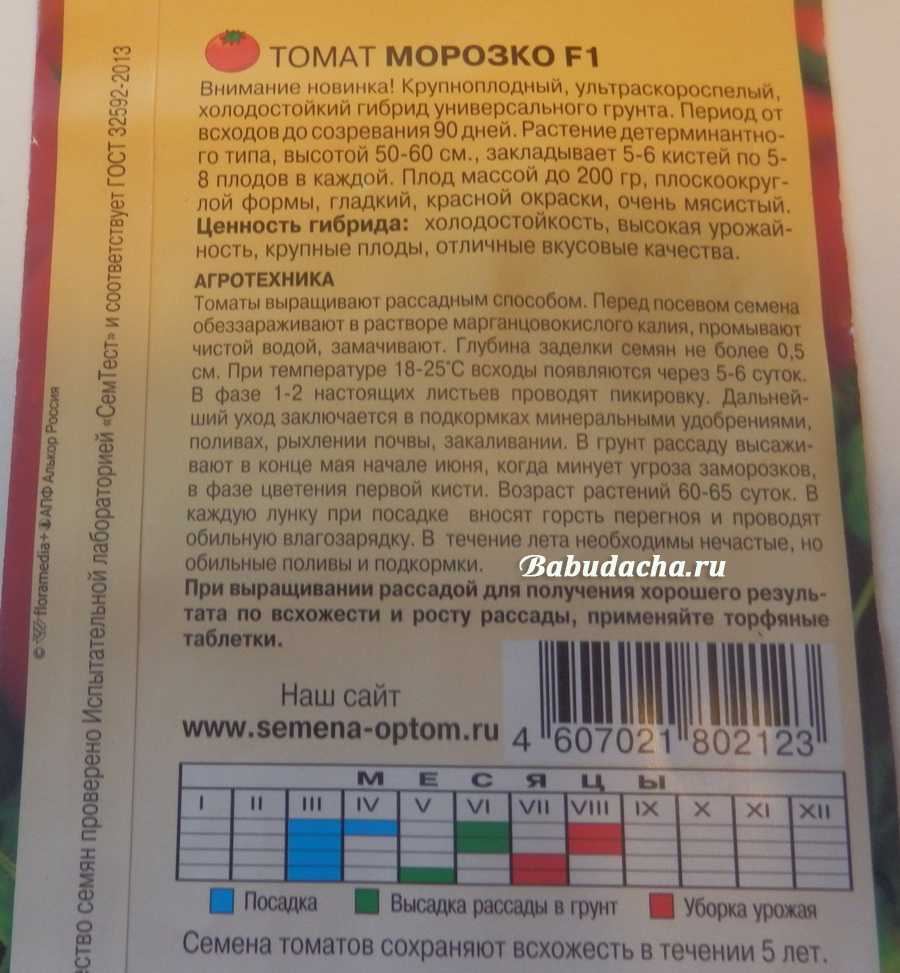 «Морозко F1» — это гибрид томатов для открытого грунта. Производитель (агрофирма «Цветущий сад») на этикетке обещает крупные, мясистые плоды красного цвета. Срок созревания: 90 дней (от появления всходов до созревания). Ультраскороспелый. Детерминантный. Средняя масса плода: до 200 г. Высота куста: 50-60 см.