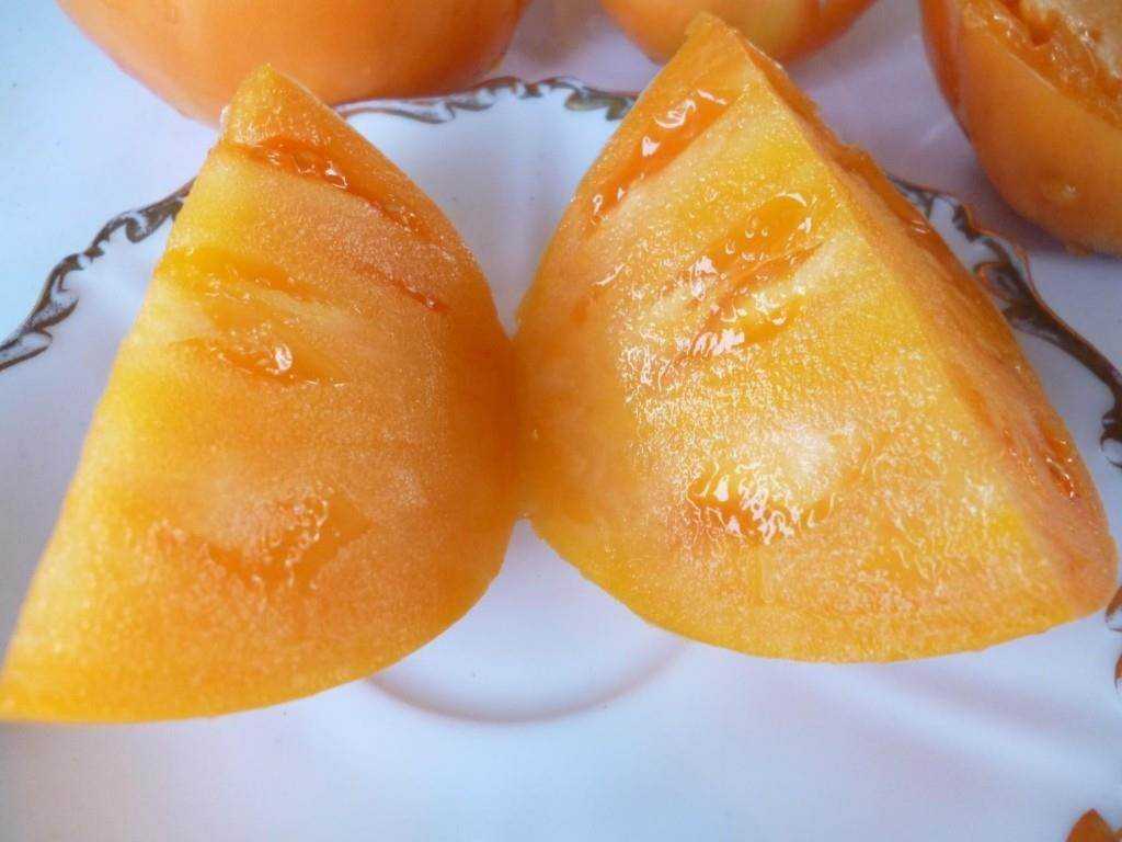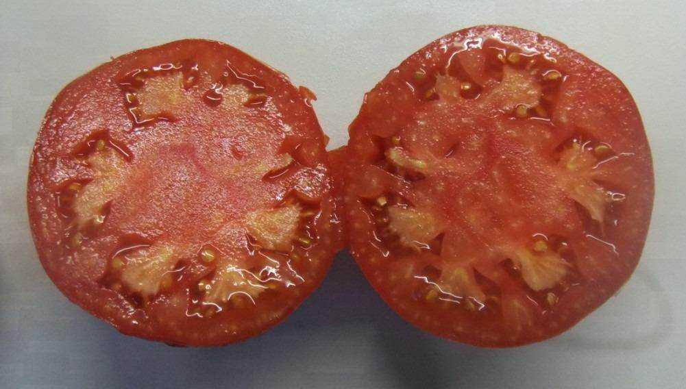 Помидоры трехкамерные, семена средних размеров. Кожица плотная, но жесткости нет. Плоды хороши для консервирования, они никогда не разваливаются. Мякоть мясистая, сладкая. Кислинка ощущается, но она приятная на вкус. Томатная паста и томатный сок получаются густыми и вкусными.