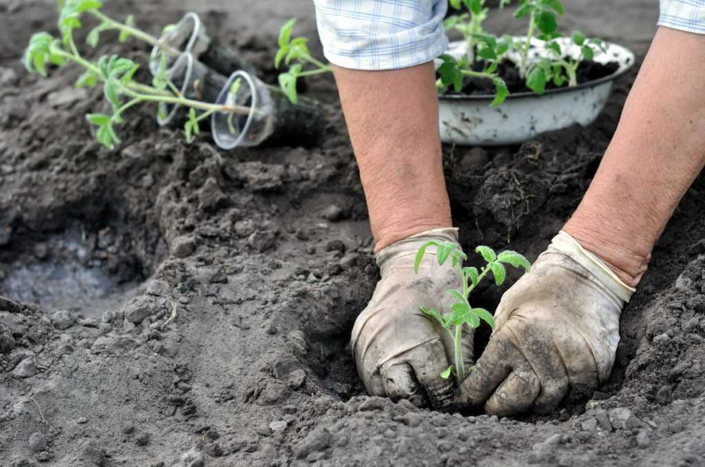 Перед высадкой в лунки добавляют минеральные удобрения или органику. Главное, чтобы корневая система томатов не находилась с ними в прямом контакте. Поверх удобрений обязательно укладывают немного плодородной почвы. Только после этого рассаду заглубляют и проводят первый полив.
