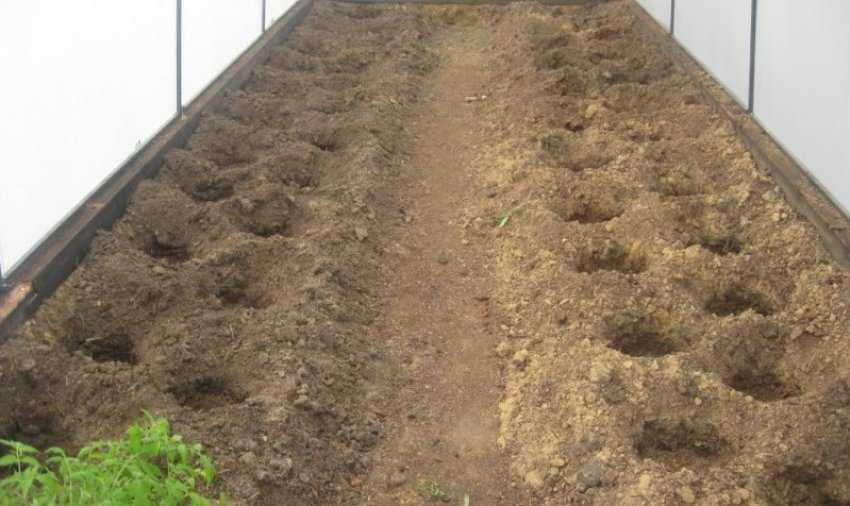 После разметки грядки овощеводы подготавливают посадочные ямки для томатных кустов. Оптимальная глубина посадочной ямы — 20–25 см.