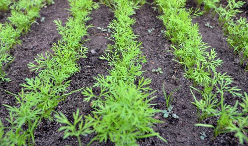 - прореживание рядов проводят после того, как ростки укропа вырастут до высоты 10 см, оставляя между ними расстояние не менее 20 см. При этом удаляют боковые побеги растений, чтобы кусты не слишком затеняли друг друга в процессе роста;