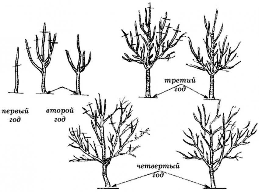 - Когда начнут расти ветви, их обрезают на уровне 0,6 м. Побеги, растущие внутрь, удаляют полностью. Ветки, которые растут в стороны, укорачивают до третьей почки. Основной ствол, или проводник, обрезают так, чтобы он всегда был выше боковых ветвей на 0,2 м.