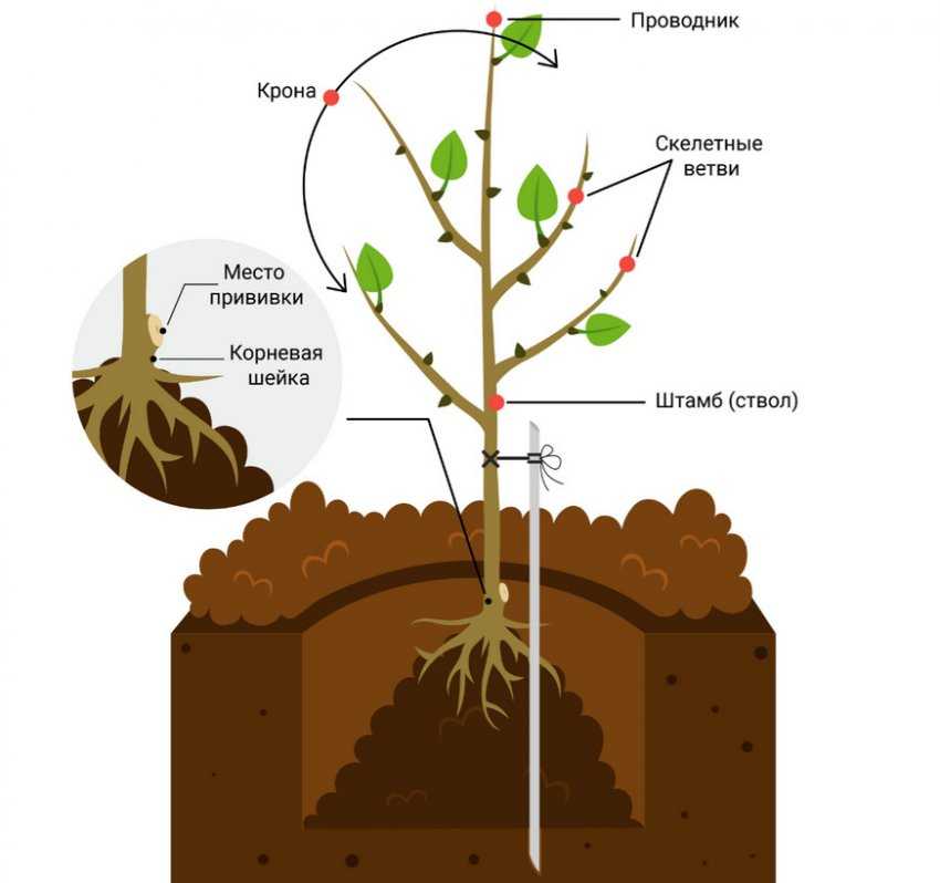 Корневую шейку расположите на 5–10 см выше уровня грунта, учитывая оседание земли после полива. Корни должны быть покрыты слоем почвы не менее 5 см.