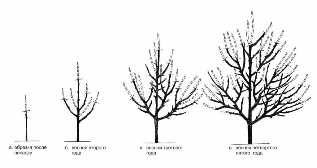 В первые три года проводят формирующую обрезку. Обычно формируют разреженно-ярусную крону из 5–7 основных веток с интервалом расположения 35–40 см.