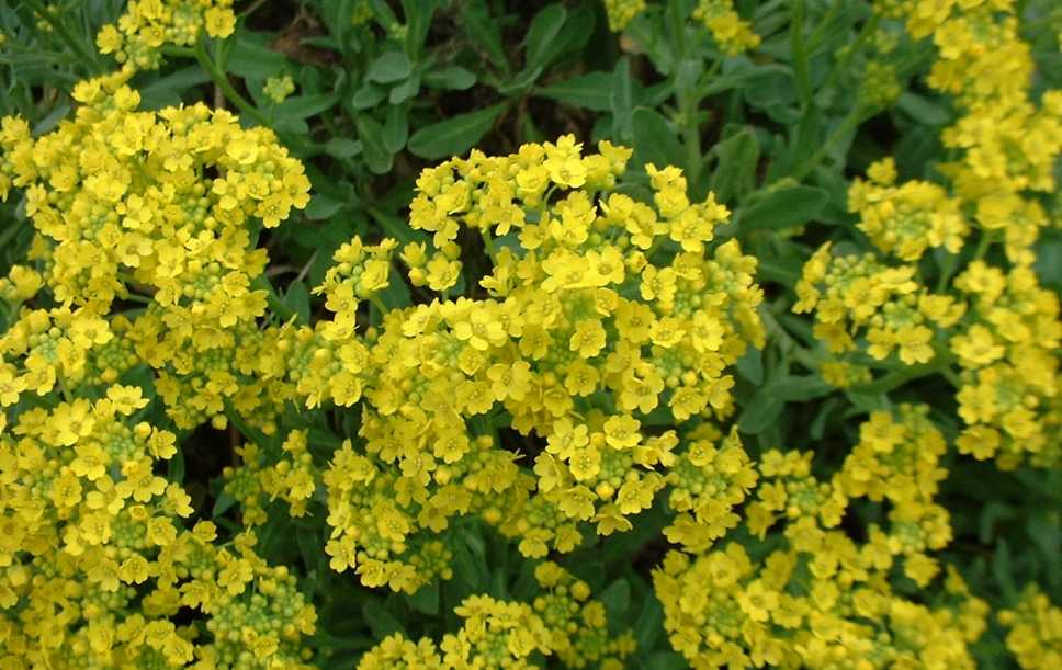 - Золотая россыпь. Кустик имеет сферическую форму. Листовые пластины узенькие. Побеги практически лежат на поверхности грунта. Маленькие плотные кистевидные соцветия состоят из насыщенно-желтых цветков. Данный сорт рекомендуется использовать для выращивания на каменистых горках, а также для украшения подпорных стенок.