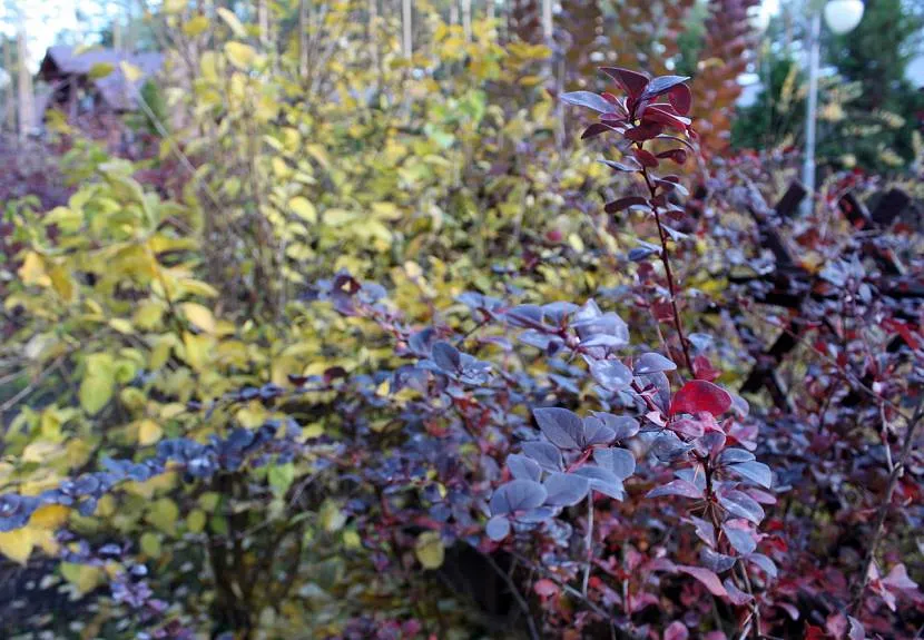 - В осенний период листва приобретает приятный фиолетовый окрас. На побегах можно заметить колючки, которые также добавляют декоративности этому кустарнику. Они имеют розоватый цвет с кремовым оттенком. Их видно сразу, так как колючки крупные и яркие.