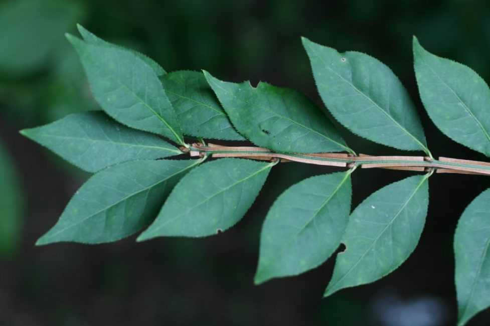 Листья темно-зеленого цвета, порядка 10 см в длину, яйцевидной формы, расширяются посредине, по краю обрамлены равномерными зубцами. Во время вегетации – насыщенно зеленые, к осени меняют цвет от зеленовато-желтого до красного и пурпурного.