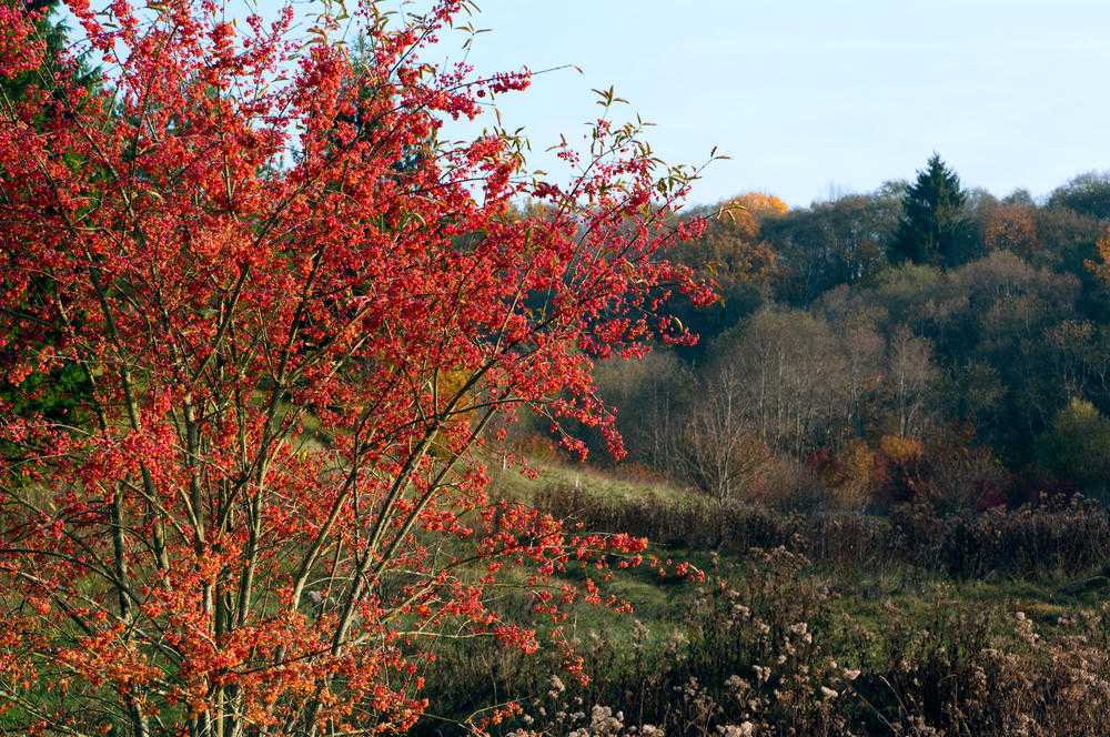Благодаря своему яркому цвету бересклет европейский также прекрасно годится на роль акцента. Пока некоторые растения все еще зелены, а другие уже пожелтели или даже сбросили листву, его красные листья вносят нотку разнообразие в привычный садовый пейзаж.