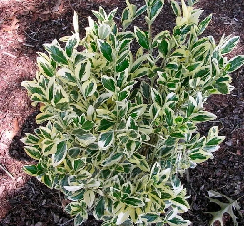 - Пёстролистый – вечнозелёный кустарник с белдно-зелёной листвой. Морозоустойчив, хорошо выдерживает снижение температуры до минус 25, но требует обязательно утепления.