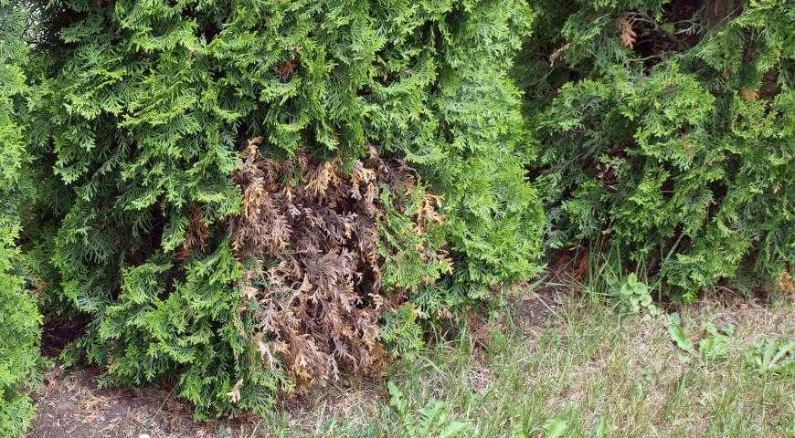 Кончики иголок начинают желтеть по разным причинам. Весной от яркого солнца возникают ожоги, появляется бронзовость. К распространенным инфекциям относятся грибковые инфекции. Ржавчина чаще появляется на сосне, поражается можжевельник. От вздутий, возникающих на ветках, споры переносятся на смородину, груши. Опасными заболеваниями считаются фузариоз, цитоспороз, фомоз. От них страдает туя. Дефекты появляются на коре, ветках. Хвоя темнеет и опадает.
