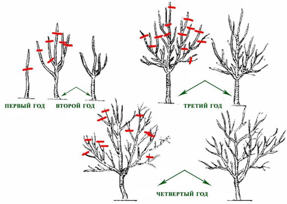В дальнейшем для формирования раскидистой и хорошо освещённой кроны её прореживают, вырезают растущие внутрь ветки. Осенью удаляют сухие и больные ветки. Формирование кроны, скелетных ветвей ведут в течение 4 лет.