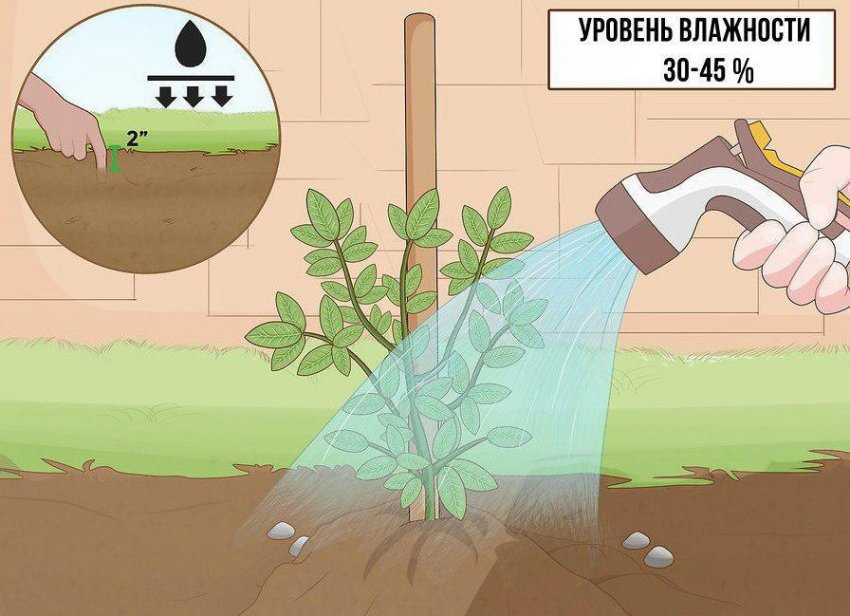 Корневую шейку при посадке нельзя заглублять более чем на 3 см, иначе ствол может загнить. Земля вблизи кустика слегка утрамбовывается. После посадки вокруг саженца выкапывают небольшую канавку для дальнейших поливов. Сразу после этого под корень нужно влить небольшими порциями 2 ведра воды.