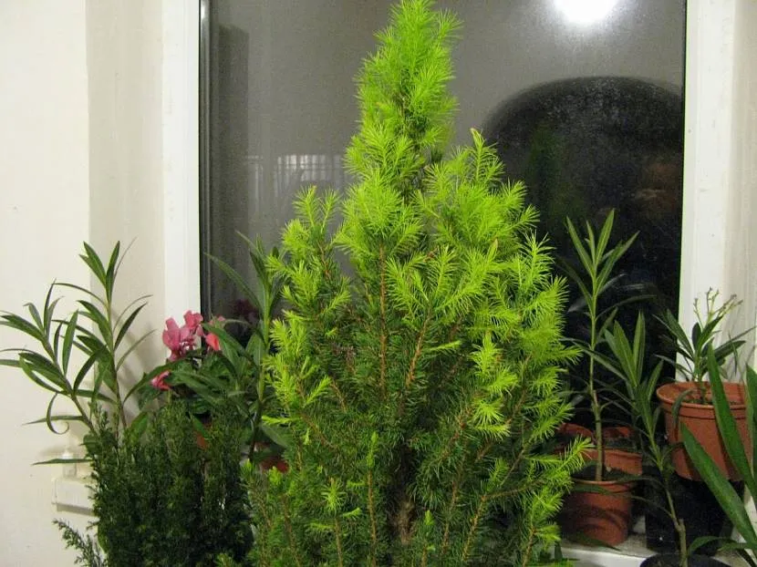 - Место, где будет находиться ель, не должно попадать под прямые солнечные лучи. Горшок периодически поворачивают к свету разными сторонами, чтобы хвоя не начала желтеть.