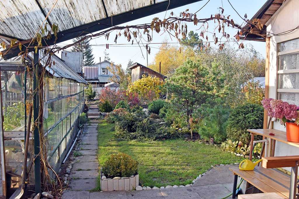 Прямо у входа нас встречает лиана актинидии коломикты, забравшаяся под кровлю навеса. В этом году хозяева собрали с неё полведра ягод. Кстати, здесь урожай меряют только в вёдрах, позднее мы к этому привыкли. Самым обильным на урожай оказался боярышник – дал шесть вёдер очень вкусных ягод размером с вишню. Он здесь не простой, а редкого вида – перистонадрезанный. Самый скромный урожай дала американская крупноплодная клюква, её даже не собирали. Россыпь алых ягод до сих пор висит на кустиках вдоль искусственного озерка. Оно появилось неслучайно: по словам Петра Яковлевича, первоначально почти половина участка в шесть соток была занята водой. Пришлось соорудить озерко, и выложить его берега камнем. Сейчас над этим водоёмом живописно склонилась извилистая ива.