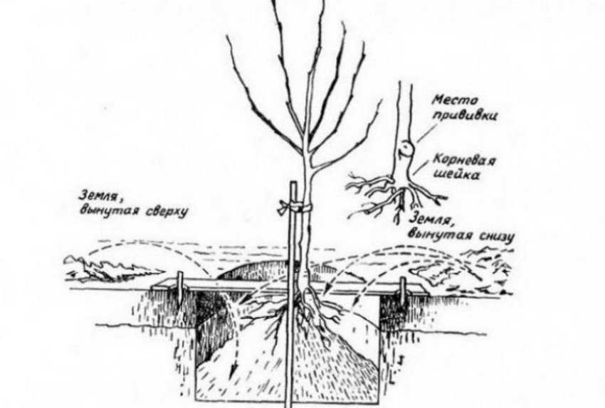 Прежде чем начинать посадочные процедуры, нужно подготовить яму — делают это с осени. Яму вырывают размерами (0,6–0,8)×(0,6–0,8)×1 м. В неё высыпают 3 ведра перегноя, 2 ведра крупного речного песка, 1 ст. суперфосфата, 3 ст. л. сульфата калия.