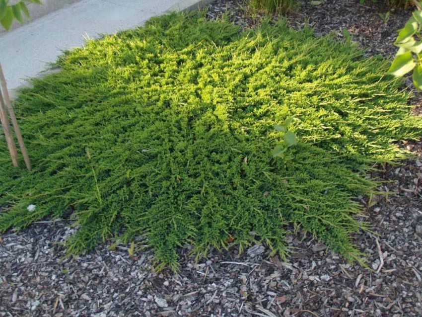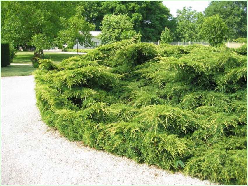 - Горизонтальный — двудомный стелющийся куст высотой не более 0,3 м. Его древесина устойчива к гниению. Культивируется растение специально для создания уникальных ландшафтных композиций. Будет выглядеть очень эффектно в сочетании с кустарниковыми и древесными формами. Благодаря стелющимся побегам создаётся впечатление, что на земле расстелен зелёный ковёр.