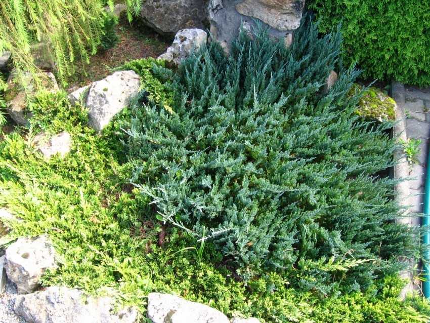 Выбирая площадку для посадки хвойника, нужно помнить и о том, с какими растениями он совместим или несовместим. Для подчеркивания изящества можжевеловых насаждений используют вереск и карликовый барбарис любого вида. Спутниками хвойной культуры могут быть спиреи желтого или оранжевого окраса. Такое сочетание рекомендовано для: