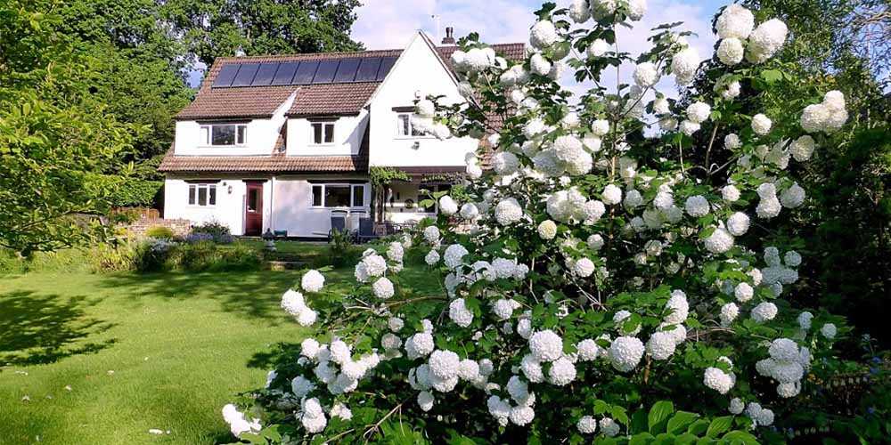 Возле дома красиво смотрится одиночный куст калины и группа растений. Красоту цветущего кустарника подчеркивает аккуратно стриженый газон, его белоснежные цветы оттеняются яркими клумбами, разбитыми вокруг растения. На дачных участках из кустов калины создают зеленые изгороди, которые эффектно выглядят в течение всего года.