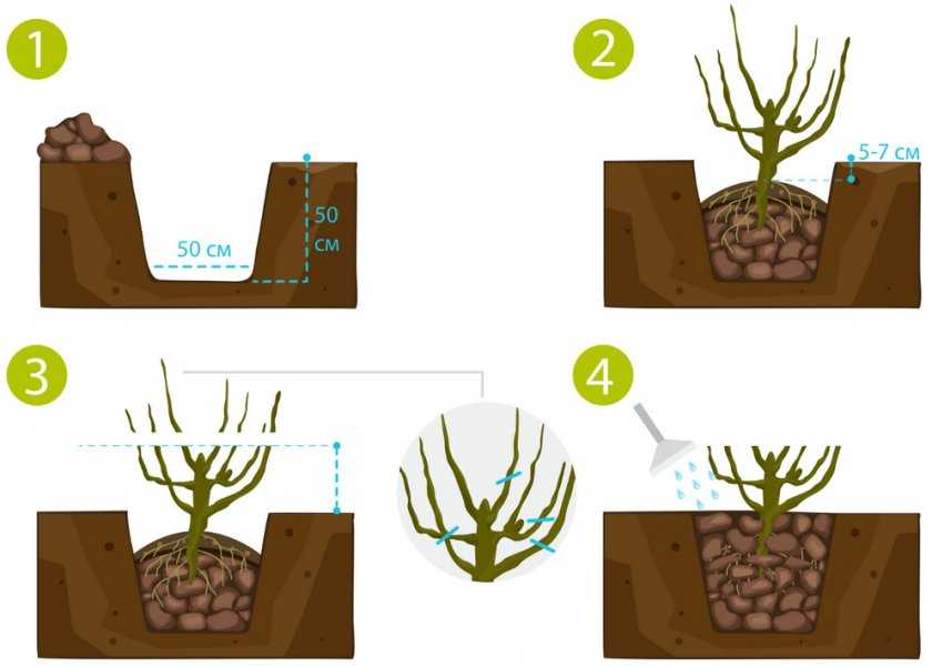 В посадочную яму размером 60х60 см добавляют перегноя или 200г суперфосфата и 80г хлористого калия. Если корневая система мощная и ей не хватает места в посадочной яме, то ее размеры увеличивают вдвое. Корни должны располагаться свободно в яме и не подгибаться . При посадке возможно заглубление корневой шейки. После посадки полить — 2-3 ведра воды на одно растение.