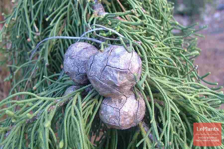 Шишки этого растения небольшого размера (12 мм в диаметре). Они образуются уже в первый год посадки и дают семена, которые можно использовать для размножения.