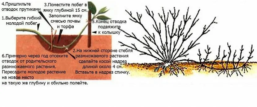 Еще один простой вегетативный способ размножения растения — горизонтальными отводками. Когда весной почва прогреется, следует выбрать на кусте здоровые крепкие побеги. Под ними выкопать бороздки и наполнить их торфом и песком. Пригнуть выбранные веточки к бороздкам и проволокой зафиксировать их. Сверху присыпать подготовленной почвосмесью. На поверхности должны остаться только верхушки побегов.