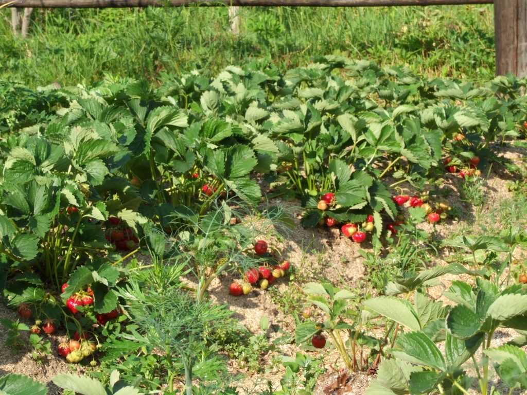 Земляника очень плохо реагирует на соседство сорняков. Также нельзя допускать, чтобы после полива, если он проводится традиционным способом — из лейки или шлангом, земля пересыхала и образовывала на поверхности плотную корку.