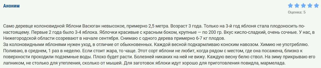 Васюган может плодоносить в первый год посадки. Хорошая урожайность наблюдается на протяжении 15 лет, после чего идет на спад. Поэтому достигшие этого возраста деревья лучше заменить молодыми саженцами.