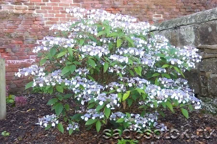 Красивый вид с крупными соцветиями до 25 см диаметром формирует кустарник или небольшое дерево высотой 3- 4 м. Стебли покрыты светлым опушением, волоски плотно прижаты к основе. Соцветия щитковидные, плотные, фиолетово-пурпурного цвета с белыми, розовыми или голубоватыми стерильными цветками. У сортовых растений цветки очень привлекательные, бахромчатые или с зазубренными краями лепестков.
