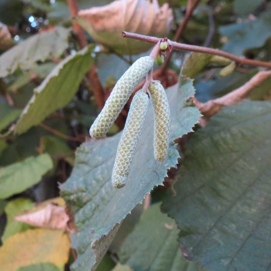 Широкоовальные листья лещины с зазубренными краями и четко выступающими прожилками позволяют с легкостью распознать растение. За тонкие длинные ветки листовые пластины крепятся сильными волосистыми черешками.