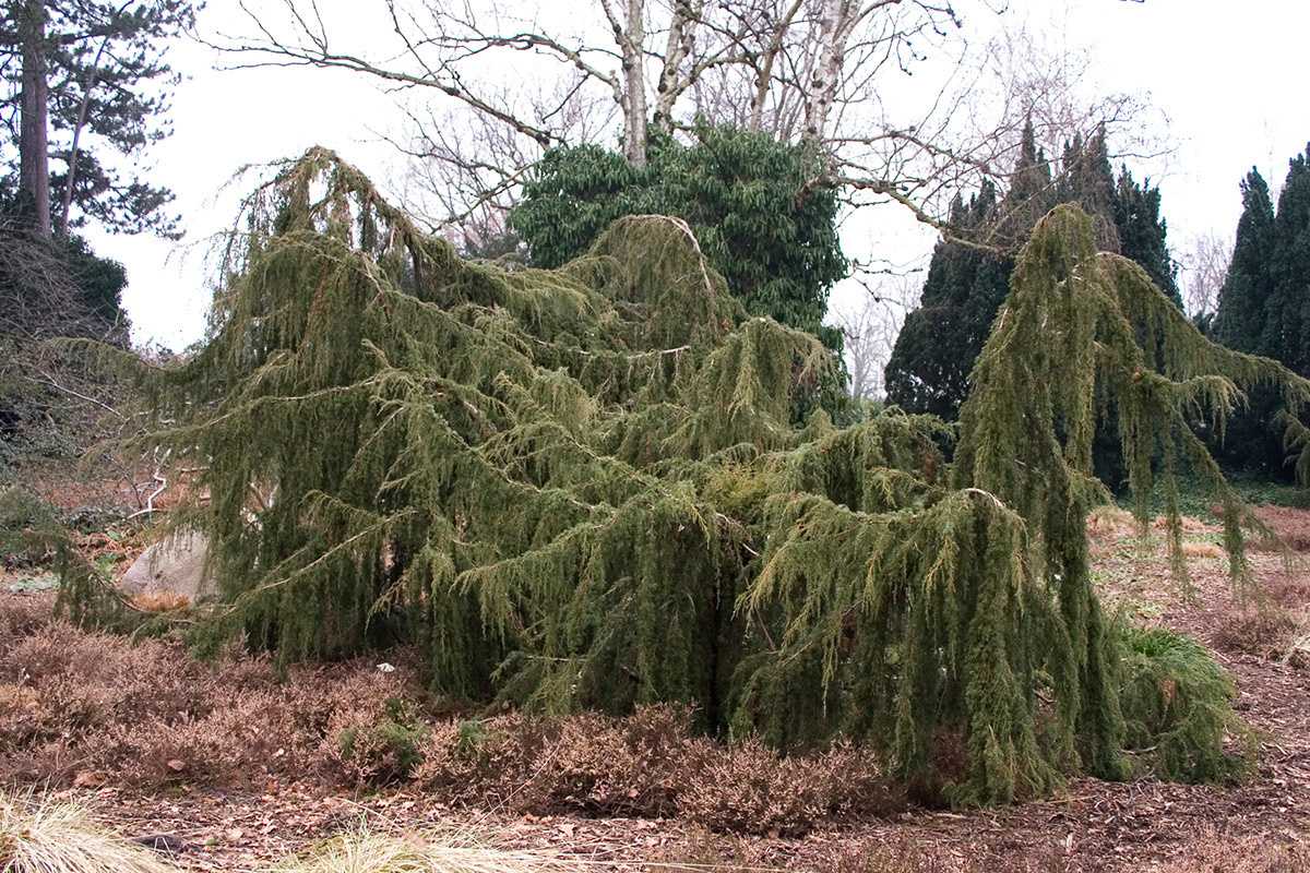 Ветви направлены вверх и вбок у основания, их кончики изгибаются к земле, придавая кроне плакучую форму.