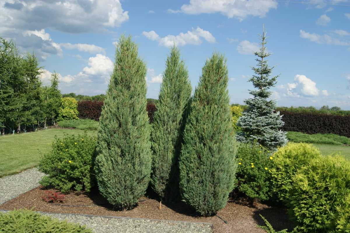 - Высоту растения. Blue Arrow не относится к высокорослым, его средняя высота – около 2 м, но может достигать 4 м. Skyrocket может вырастать до 8 м, у входа в дом такого гиганта не посадишь.