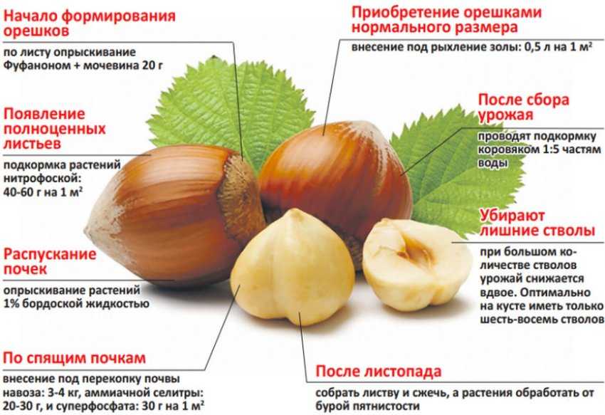 Уход за растением должен быть качественным и своевременным — только тогда можно ожидать щедрый урожай. Не следует думать, что если плод орехового дерева надёжно защищён от окружающей среды, само растение тоже отличается исключительной выносливостью. Лещине нужны полив, внесение удобрений и прочие процедуры, соответствующие её потребностям.