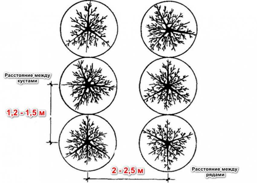 Сажать представителей этого вида следует в соответствии с популярной схемой, которая проверена годами, придерживаясь правильного расстояния не только в междурядье, но и между кустарниками. Помните, что на одном месте это растение будет расти и плодоносить около 20–25 лет, так что, один раз тщательно распланировав участок, вы обеспечите высокую урожайность на многие годы.