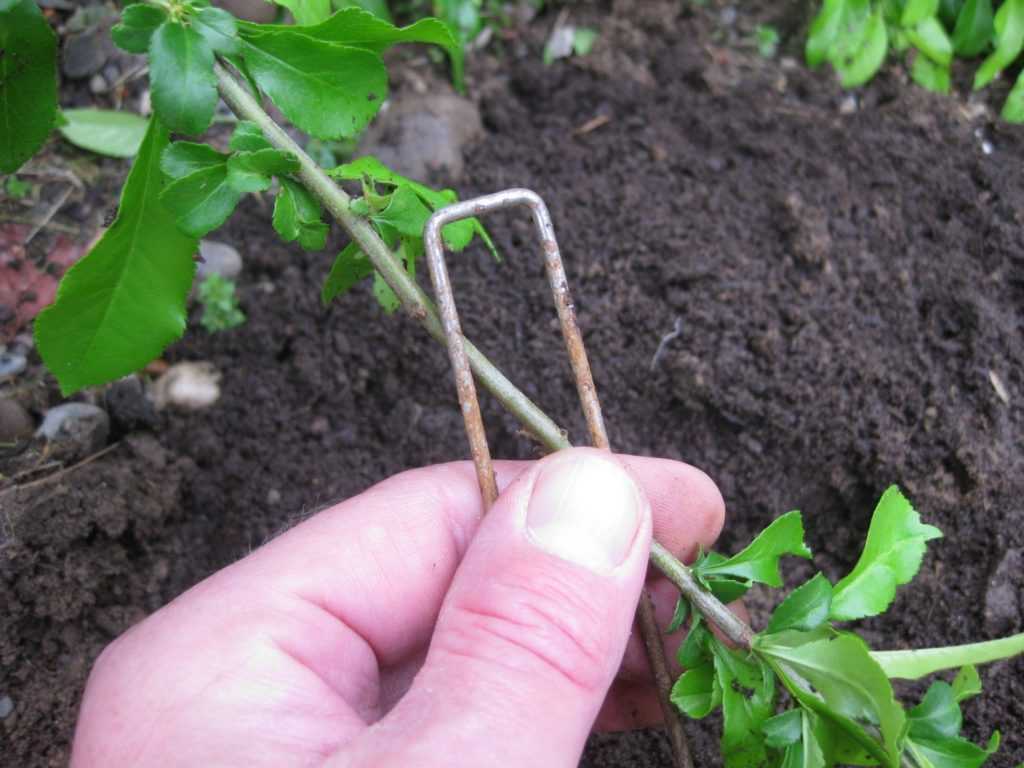 Самый легкий способ – это размножение отводками. Берут нижний побег, пригибают к земле в заранее вырытую канавку, прижимают в середине и засыпают землей с торфом.