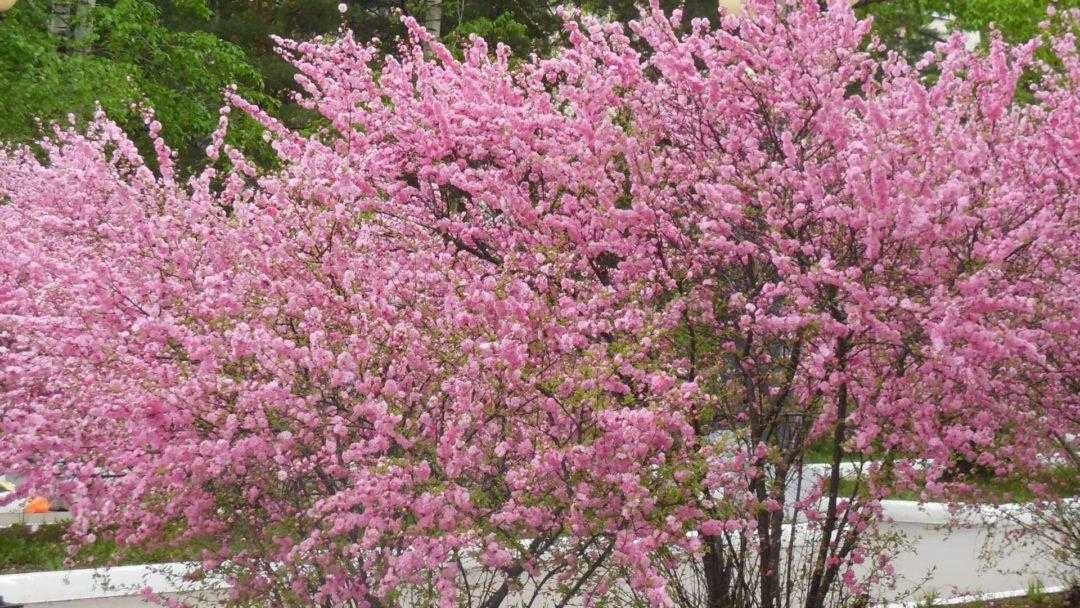Миндаль трехлопастной (Prúnus tríloba) – это кустарное растение с цветками розоватого цвета. Это растение также имеет название луизеания трехлопастная, но в народе его называют подмосковной сакурой