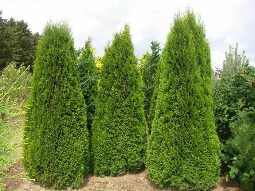 Смарагд – дерево с конической формой. Хвоя изумрудно-зелёная, крона плотная. Популярен в городах с умеренным климатом, потому что устойчив к нестабильной погоде. Скорость роста – от 15 до 25 сантиметров в год.