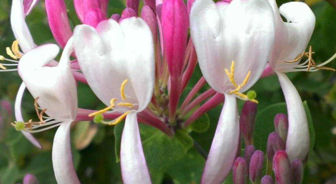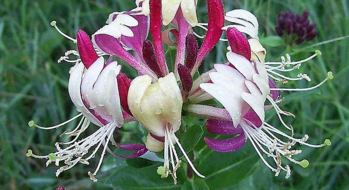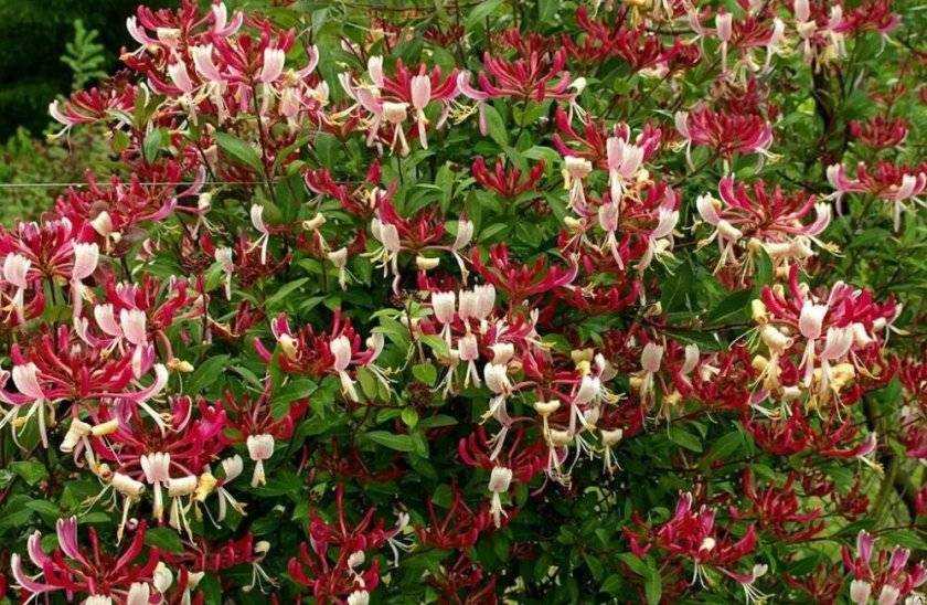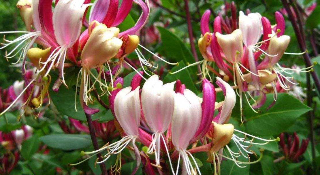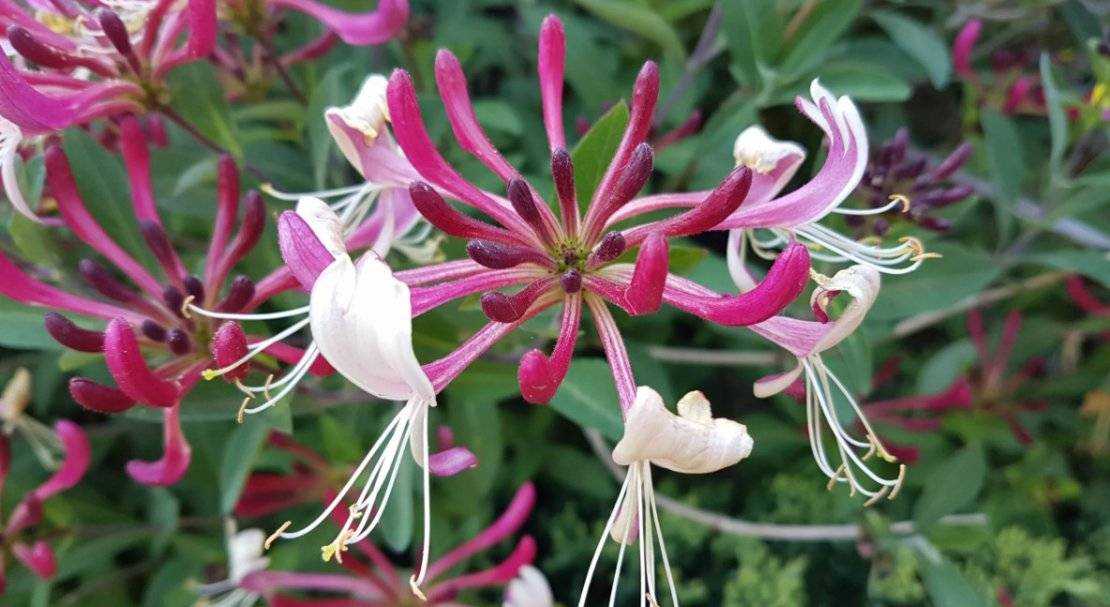 Жимолость вьющаяся привлекает внимание роскошными соцветиями. Её цветы имеют необычную форму