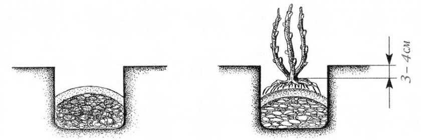 Если в качестве посадочного материала используют молодое растение, необходимо подготовить ямку размером 50×50×50 см. На дно засыпают дренаж слоем 5–7 см, который покрывают почвой, смешанной с песком и торфом, в соотношении, указанном ранее. Заглубляют саженец до уровня корневой шейки.