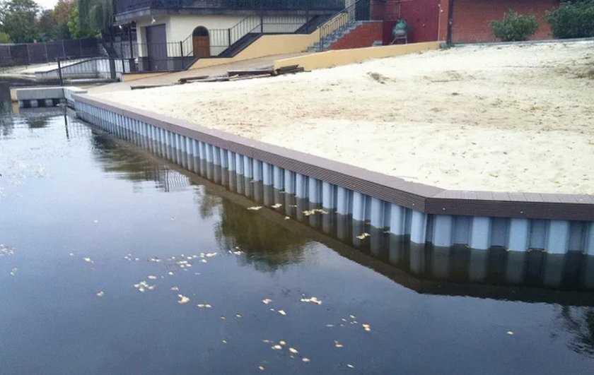 В результате из шпунта ПВХ выстраивается надёжная береговая линия, причём можно выбрать цвет материала. На каждой шпунтовой свае есть рёберный выступ, который обеспечивает сцепление с соседними деталями. Минус в том, что в плотный грунт, если берег высокий, шпунт придётся погружать гидравлическим оборудованием. Или приложить немало усилий.